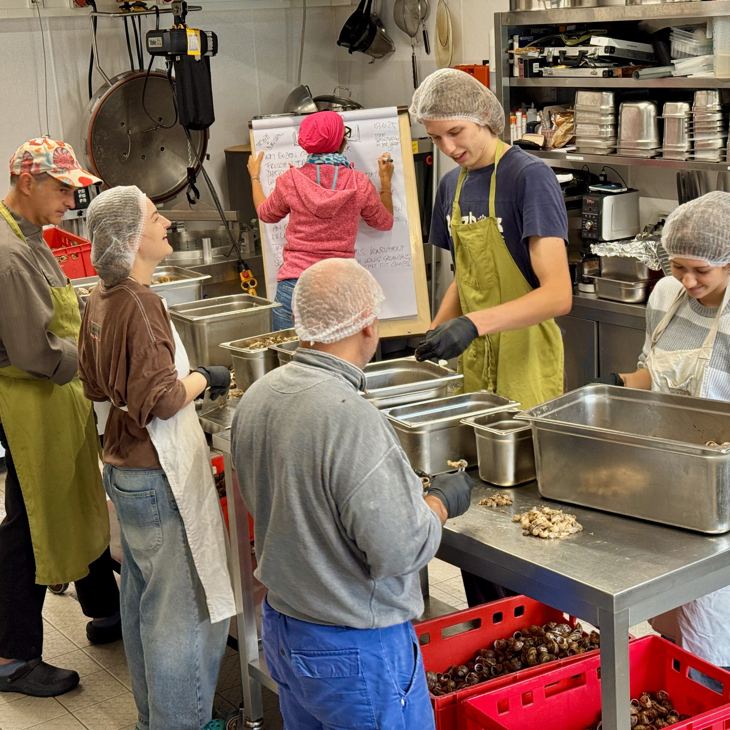 Diese gemeinsame Arbeit ist bewusst Teil unseres Systems. Jede Produktion wird zum Lernraum: Das Küchenteam bekommt Einblick in Anbau und Ernte, das Gartenteam erlebt, wie Rohstoffe weiterverarbeitet werde.